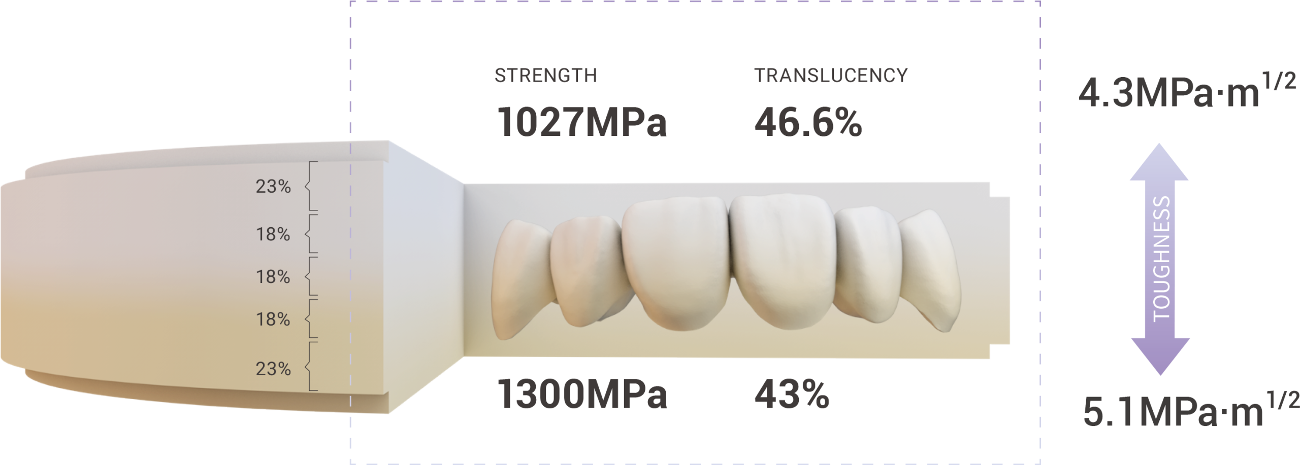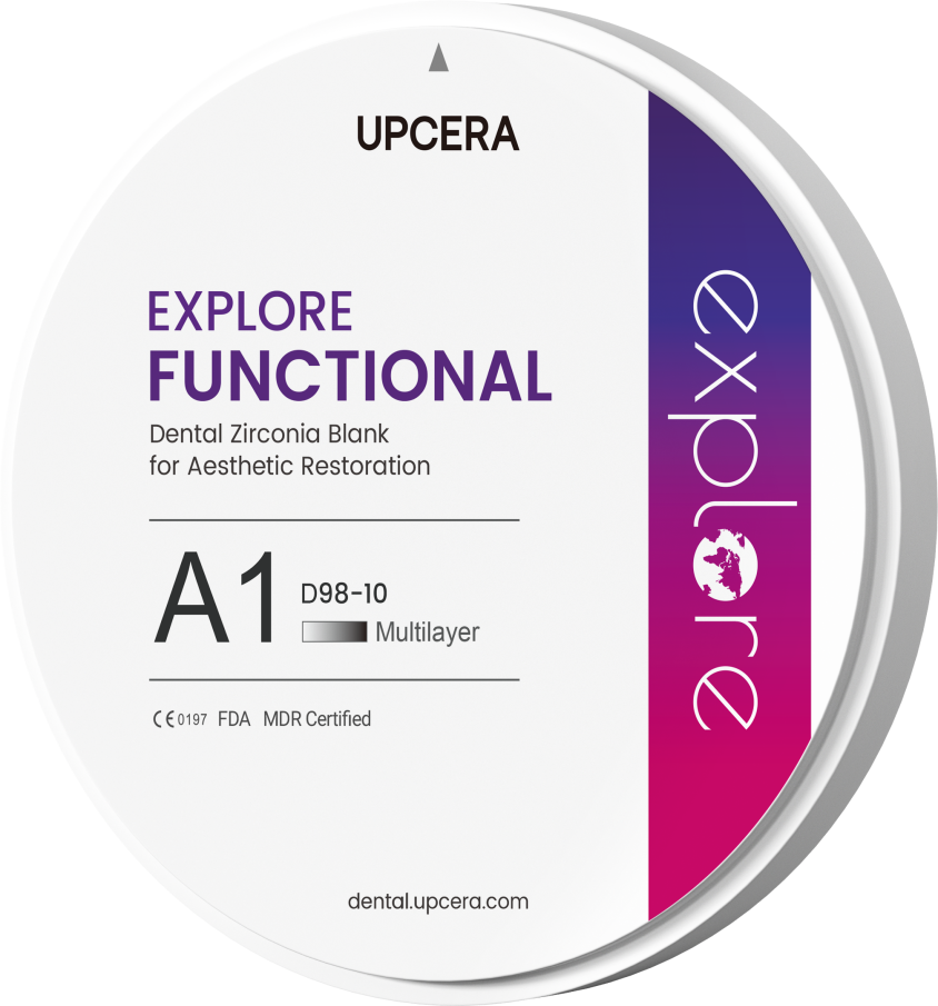 Upcera Explore Functional is a new generation of multilayered, pre-shaded zirconia. This puck combines 3Y & 4Y Zirconia in a seamless gradient of chroma, strength, translucency, and toughness. Whether it’s a single unit posterior or full arch hybrid, Explore Functional is up for the task. Furthermore, Explore Functional has a sister product called Explore Esthetic that is perfectly color-matched to provide maximum color compatibility with uncompromised esthetic expectations.